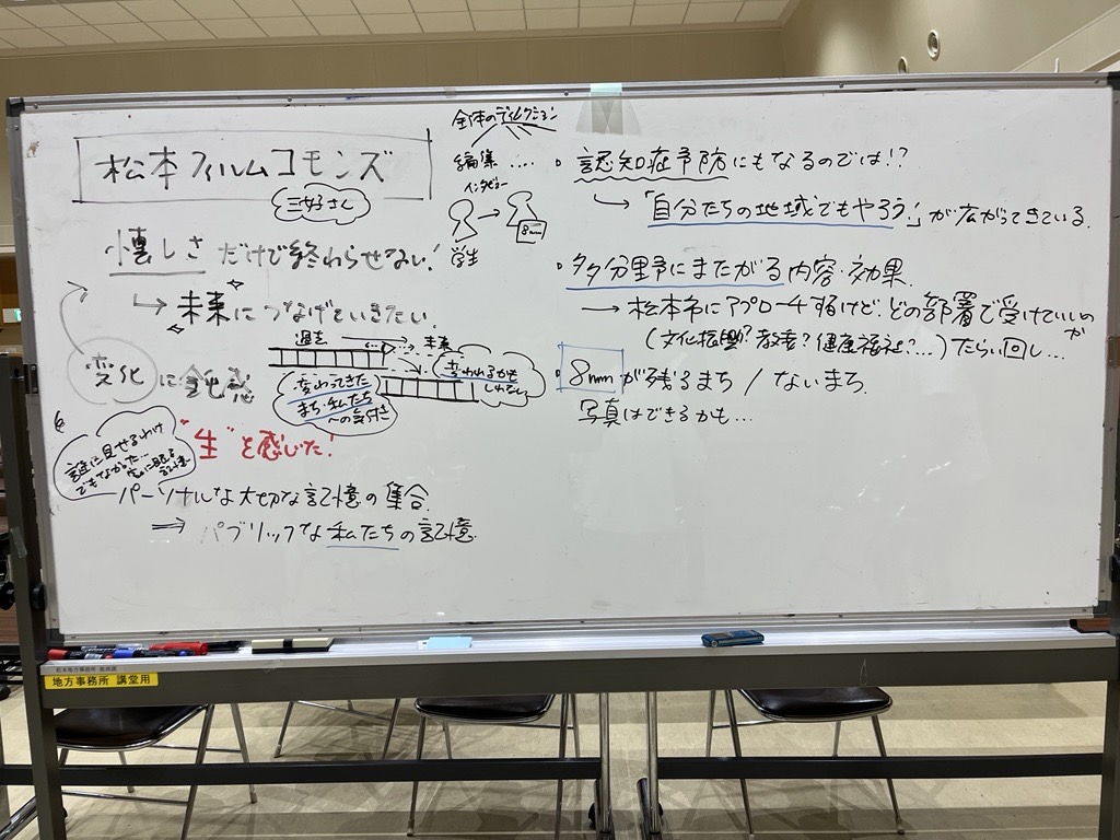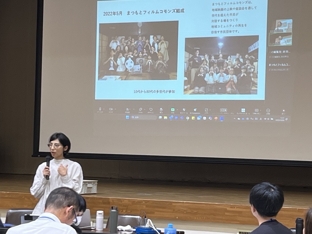 2022年に立ち上がった市民団体、まつもとフィルムコモンズの三好さんから活動を紹介していただきました。松本市内の家庭に残っている8ミリフィルムを集め、再編集して映画にし、公開することで地域のつながりもまた再編集していくという活動です。上映会は座談会とセットで開催し、多世代が対話する場が作られているとのこと。市民はボランティアとしてフィルムの選定や音楽制作なども担当しているそうです。映画製作と上映会、座談会を通して、「映像が未来につながる」「風景が時間軸でつながる」「過去の自分とつながる」「家族がつながる」「多世代がつながる」「地域がつながる」という多様なつながりをもたらしているということが共有されました。