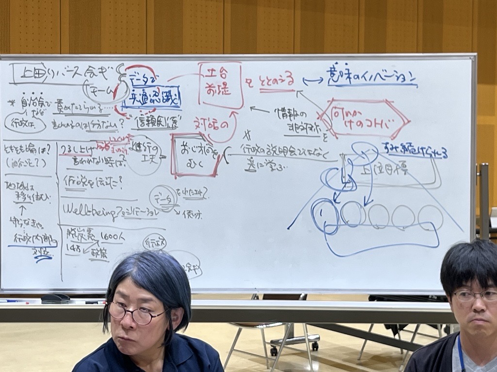2021年から始めた上田リバース会議の活動の紹介と、対話を活かしてきた経験を共有していただきました。「これまでの取り組みの中で行政職員と会話のキャッチボールができない経験もあったけれど、客観的な地域のデータを間に置くことで、対話が進んだり行政の苦労がわかることもあった。行政と市民は立場が違うからこそタッグが組める。行政が時代に合った施策を進められるように背中を押すのは市民のミッションではないかと考えている」というお話がありました。