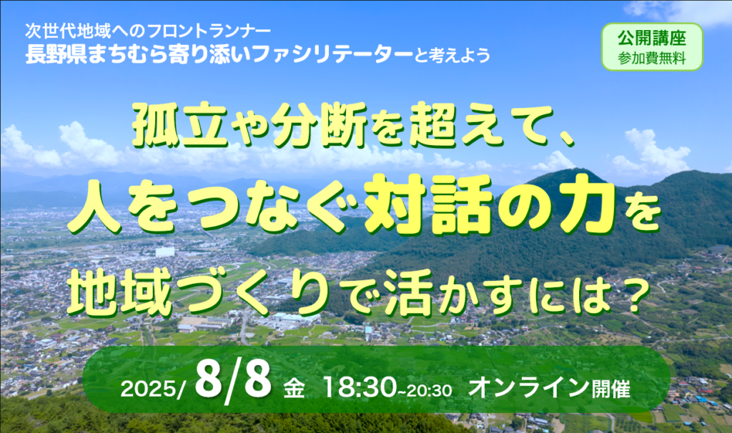 2025年8月8日(金)に長野県まちむら寄り添いファシリテーター養成講座公開講座がオンライン(zoom)で開催され、「孤立や分断を超えて、人をつなぐ対話の力を地域づくりで活かすには」というテーマで「対…